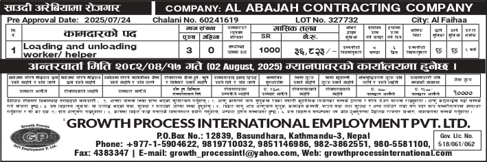 Growth Process International Employment P. Ltd. one of the leading manpower recruitment agency in Nepal, Government Registration No. 30656/061/062 & Government license no 518/061/062 has established at Kathmandu, Nepal since 2004,